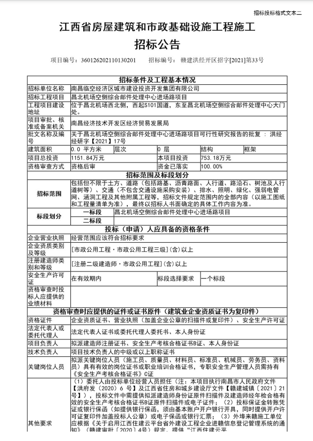 昌北機(jī)場空側(cè)綜合郵件處理中心進(jìn)場路項目招標(biāo)公告